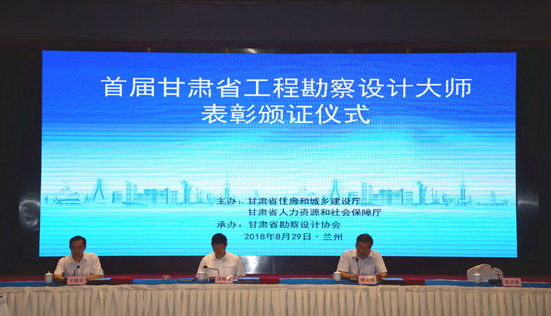 2018年8月29日上午,全省勘察設(shè)計(jì)行業(yè)發(fā)展座談會(huì)暨首屆甘肅省工程勘察設(shè)計(jì)大師表彰頒證儀式在組工大廈舉行,表彰12名全省首屆工程勘察設(shè)計(jì)大師,并就勘察設(shè)計(jì)行業(yè)的發(fā)展方向和思路進(jìn)行了交流探討。在頒證儀式上,我公司董事長、黨委書記章海峰同志獲“甘肅省工程勘察設(shè)計(jì)大師”榮譽(yù)稱號(hào),并獲頒獎(jiǎng)狀獎(jiǎng)牌。