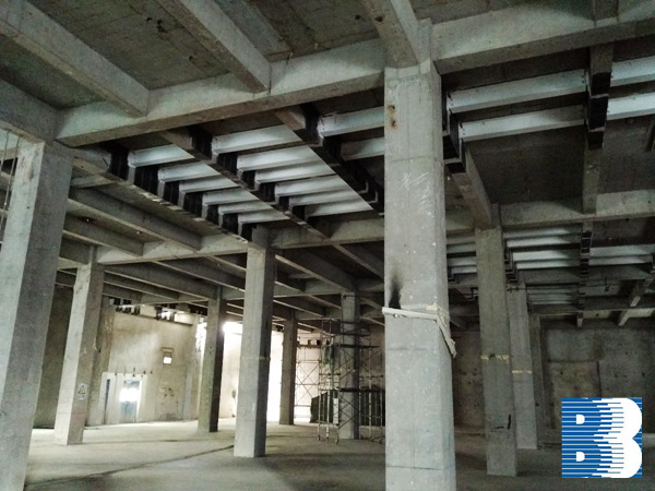 從2015年11月下旬開始,我院鋼結(jié)構(gòu)研發(fā)中心在招投標(biāo)工作結(jié)束之后,及時對施工圖深入細化,優(yōu)化施工方案,科學(xué)展開各項施工作業(yè)。整個項目的重點和難點在于對地上一、二層頂板H型鋼梁進行加固,以及鋼梁端部原框架梁碳纖維的加固補強等方面。為此,研發(fā)中心的技術(shù)人員分別采用了鋼結(jié)構(gòu)鋼梁制作安裝、對框架梁進行碳纖維加固等方式。