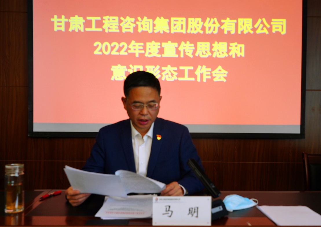 3月28日,甘肅工程咨詢(xún)集團(tuán)召開(kāi)2022年度宣傳思想和意識(shí)形態(tài)工作會(huì)議,傳達(dá)學(xué)習(xí)了全國(guó)、全省宣傳部長(zhǎng)會(huì)議精神,黨委副書(shū)記王春燕總結(jié)了2021年度宣傳思想和意識(shí)形態(tài)工作情況并安排部署2022年度工作,黨委副書(shū)記、總經(jīng)理馬明作講話。黨委委員、監(jiān)事會(huì)主席焦軍毅主持會(huì)議,集團(tuán)公司領(lǐng)導(dǎo)班子成員,相關(guān)部門(mén)負(fù)責(zé)人在主會(huì)場(chǎng)參加,各子公司黨委書(shū)記、董事長(zhǎng)(執(zhí)行董事)、總經(jīng)理、黨委副書(shū)記,相關(guān)部門(mén)負(fù)責(zé)人在分會(huì)場(chǎng)參加。