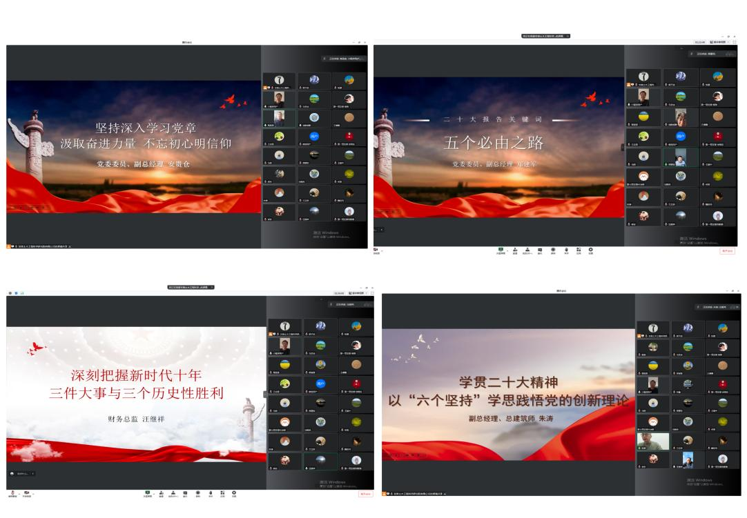 會議圍繞黨章、“五個必由之路”、新時代十年三件大事與三個歷史性勝利及“六個堅持”的創(chuàng)新理論等方面對黨的二十大精神開展了專題宣講。領(lǐng)導(dǎo)班子成員安貴倉、鄭建軍、汪繼祥、朱濤分別結(jié)合工作實際,從不同角度對黨的二十大報告進(jìn)行了重點闡釋。最后,黨委書記、董事長董紅健以“牢記初心使命 深化自我革命”,黨委副書記、董事、總經(jīng)理馬靈會以“堅持以推動高質(zhì)量發(fā)展為主題貫徹新發(fā)展理念、服務(wù)新發(fā)展格局”為題,緊密結(jié)合各自思想和工作實際進(jìn)行了交流發(fā)言,談學(xué)習(xí)心得體會,談推進(jìn)工作的思路舉措,一致表示要發(fā)揮好領(lǐng)導(dǎo)干部“先學(xué)一步、深學(xué)一層”的表率作用,深學(xué)細(xì)悟新思想、對標(biāo)對表新部署、團(tuán)結(jié)奮斗新征程,深刻領(lǐng)悟“兩個確立”的決定性意義,不斷增強(qiáng)“四個意識”、堅定“四個自信”、做到“兩個維護(hù)”,以實際行動為企業(yè)高質(zhì)量發(fā)展不懈努力。