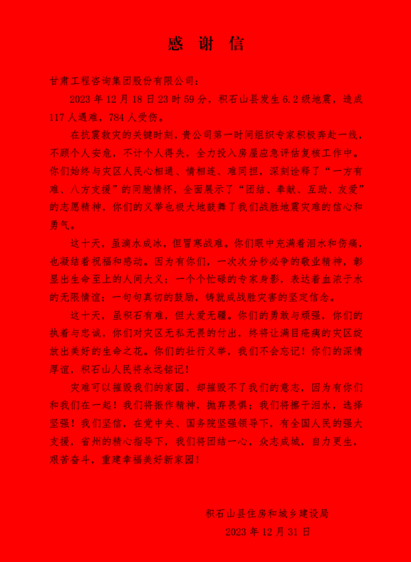 1月3日上午,積石山縣住房和城鄉(xiāng)建設(shè)局向甘肅工程咨詢集團(tuán)贈(zèng)送“為百姓不懼艱險(xiǎn),戰(zhàn)險(xiǎn)情奮勇爭(zhēng)先”錦旗,并發(fā)來《感謝信》,對(duì)在抗震救災(zāi)關(guān)鍵時(shí)刻奔赴災(zāi)區(qū)開展房屋應(yīng)急評(píng)估工作的專家表達(dá)感謝和敬意。