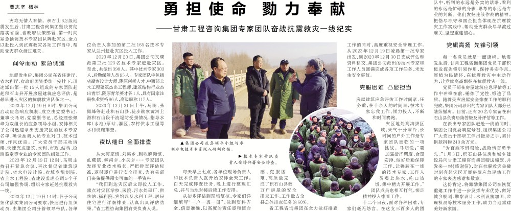 1月15日,《甘肅日報》第4版刊載《勇?lián)姑?勠力奉獻——甘肅工程咨詢集團專家團隊奮戰(zhàn)抗震救災(zāi)一線紀(jì)實》。該報道全面反映了集團公司黨委心系災(zāi)區(qū)、聞令而動的一系列擔(dān)當(dāng)作為務(wù)實舉措,深度展現(xiàn)了專家團隊和干部職工向險而行、甘于奉獻的抗震救災(zāi)生動實踐,進一步凝聚起奮力奪取抗震救災(zāi)全面勝利的強大力量。