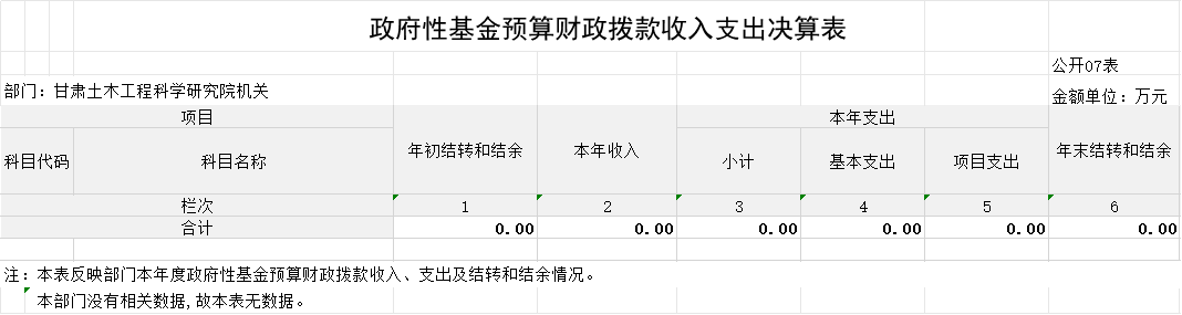 2023年度政府性基金預(yù)算財(cái)政撥款年初結(jié)轉(zhuǎn)和結(jié)余0.00萬(wàn)元,本年收入0.00萬(wàn)元,本年支出 0.00萬(wàn)元,年末結(jié)轉(zhuǎn)和結(jié)余 0.00萬(wàn)元,