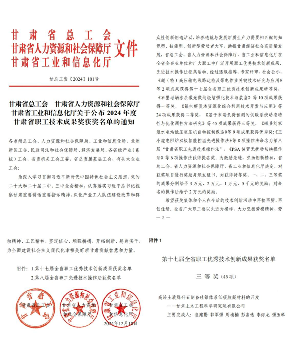 近日,甘肅省總工會(huì)、甘肅省人力資源和社會(huì)保障廳、甘肅省工業(yè)和信息化廳公布了2024年度甘肅省職工技術(shù)成果獎(jiǎng)獲獎(jiǎng)名單,公司材料科學(xué)與工程研究院崔建勤等同志完成的《高嶺土質(zhì)煤矸石制備硅鋁體系低碳膠凝材料的開發(fā)》榮獲第十七屆全省職工優(yōu)秀技術(shù)創(chuàng)新成果三等獎(jiǎng)。