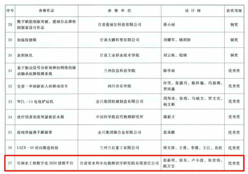 在甘肅省第七屆BIM技術(shù)應(yīng)用大賽中,建筑設(shè)計院、水電設(shè)計院報送的項目共斬獲12項獎勵,包攬了設(shè)計組16個獎項中的10項。在甘肅省第五屆“創(chuàng)新杯”工業(yè)設(shè)計大賽中,水電設(shè)計院《引調(diào)水工程數(shù)字化BIM建模平臺》項目獲優(yōu)秀獎。在第十七屆全省職工優(yōu)秀技術(shù)創(chuàng)新成果獎中,水電設(shè)計院、土木工程院申報的兩個項目分獲創(chuàng)新成果獎三等獎,其中,《棄渣場三維設(shè)計平臺》項目是全省水利系統(tǒng)唯一獲獎成果。