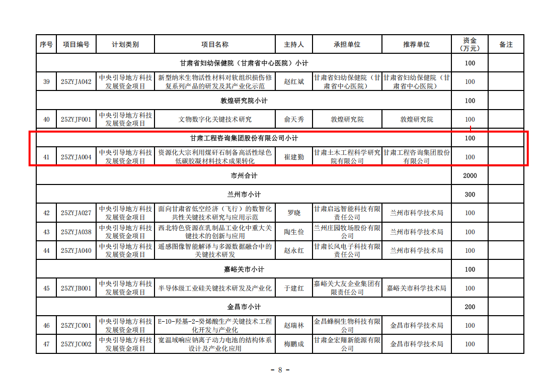 近日,甘肅省科技廳公布了2025年度科技重大專項(xiàng)計(jì)劃(中央引導(dǎo)地方科技發(fā)展資金項(xiàng)目)立項(xiàng)名單,我公司主持申報(bào)的“資源化大宗利用煤矸石制備高活性綠色低碳膠凝材料技術(shù)成果轉(zhuǎn)化”項(xiàng)目成功立項(xiàng),標(biāo)志著公司在煤矸石資源化利用領(lǐng)域取得重大突破,將為推動(dòng)甘肅省綠色低碳發(fā)展貢獻(xiàn)力量。