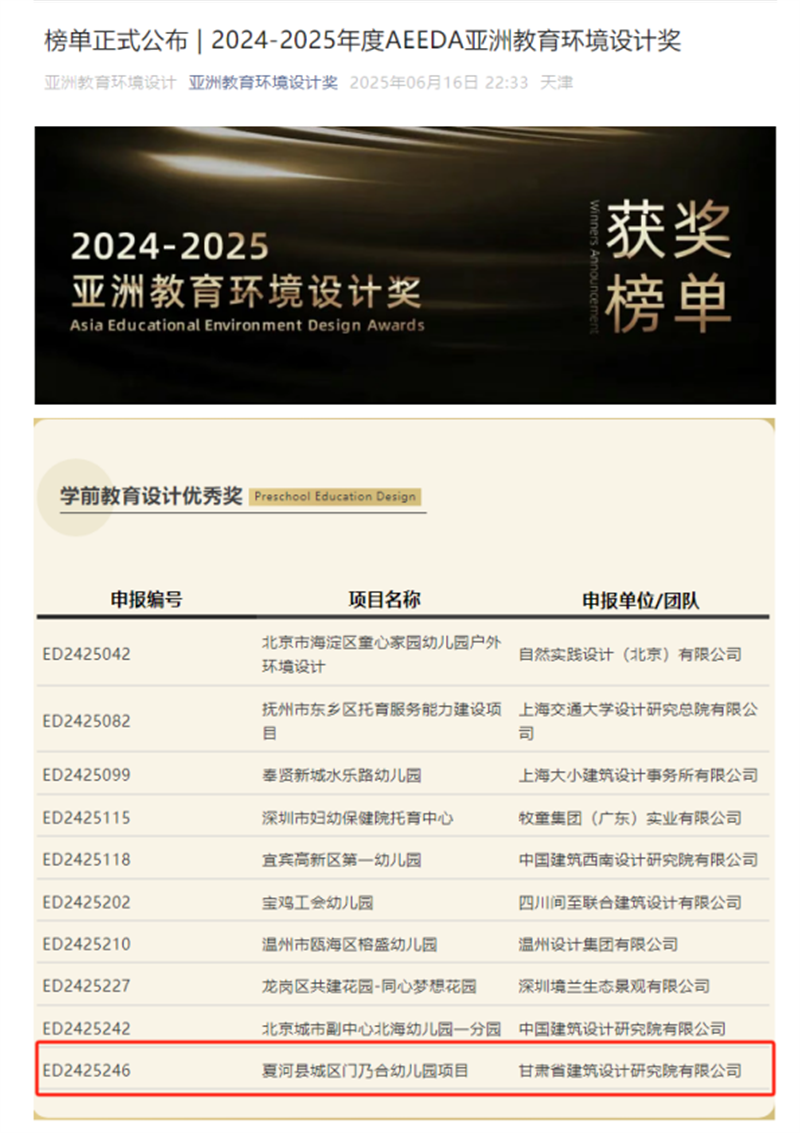 近日,備受矚目的2024-2025年度AEEDA亞洲教育環(huán)境設(shè)計(jì)獎(jiǎng)(Asia Educational Environment Design Awards)獲獎(jiǎng)名單正式揭曉。由甘肅工程咨詢集團(tuán)旗下省建筑設(shè)計(jì)院設(shè)計(jì)的夏河縣城區(qū)門乃合幼兒園項(xiàng)目,從百余件參賽作品中脫穎而出,榮膺學(xué)前教育設(shè)計(jì)領(lǐng)域優(yōu)秀獎(jiǎng),為甘肅建筑設(shè)計(jì)行業(yè)贏得了國(guó)際聲譽(yù)。