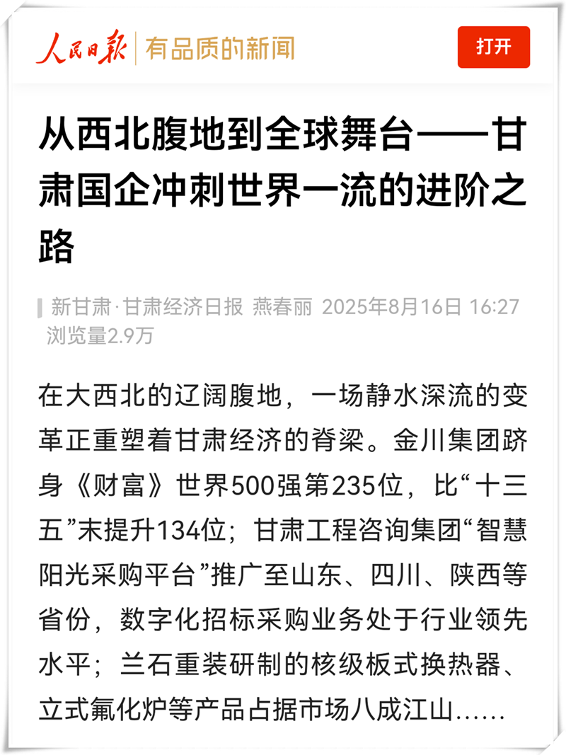 在大西北的遼闊腹地,一場靜水深流的變革正重塑著甘肅經(jīng)濟的脊梁。金川集團躋身《財富》世界500強第235位,比“十三五”末提升134位;甘肅工程咨詢集團“智慧陽光采購平臺”推廣至山東、四川、陜西等省份,數(shù)字化招標(biāo)采購業(yè)務(wù)處于行業(yè)領(lǐng)先水平;蘭石重裝研制的核級板式換熱器、立式氟化爐等產(chǎn)品占據(jù)市場八成江山……