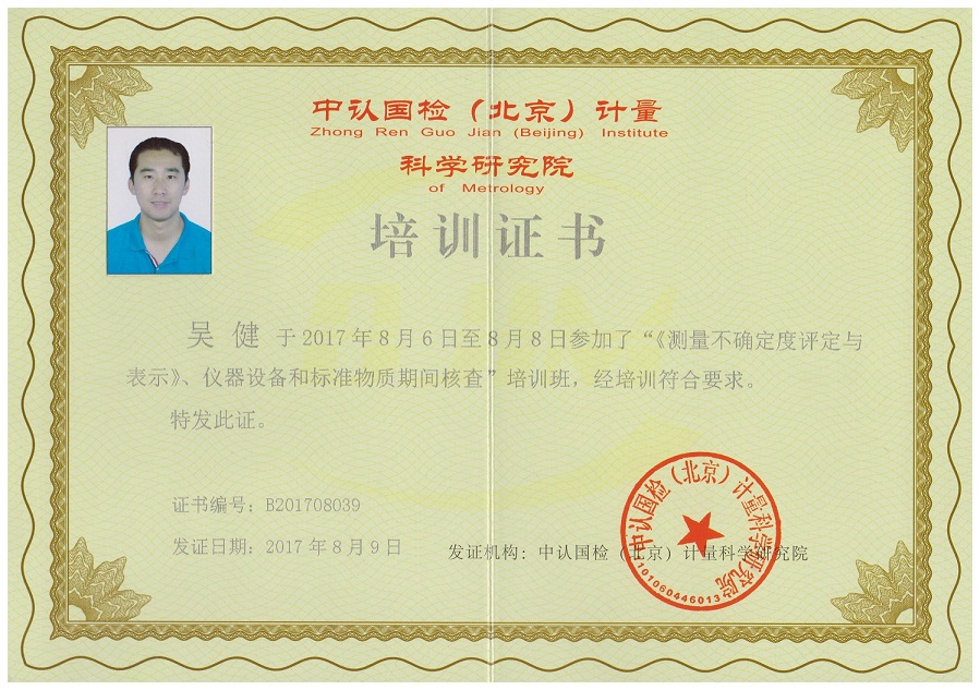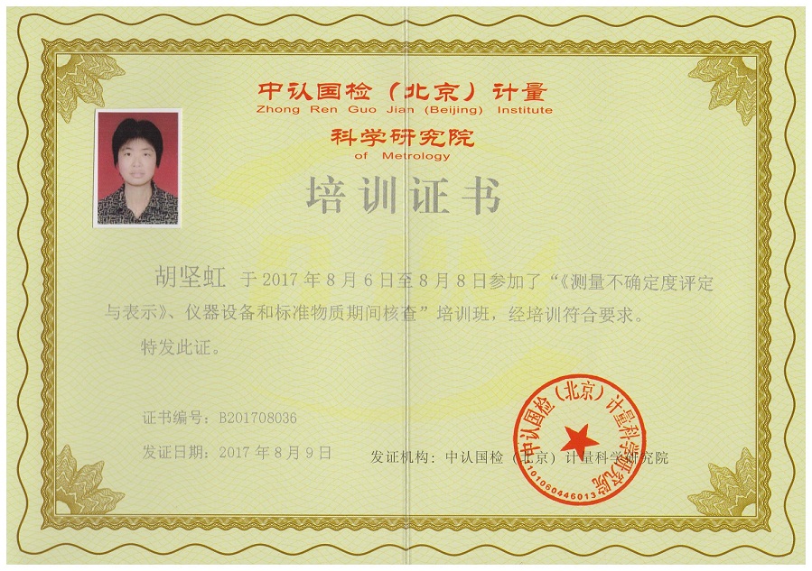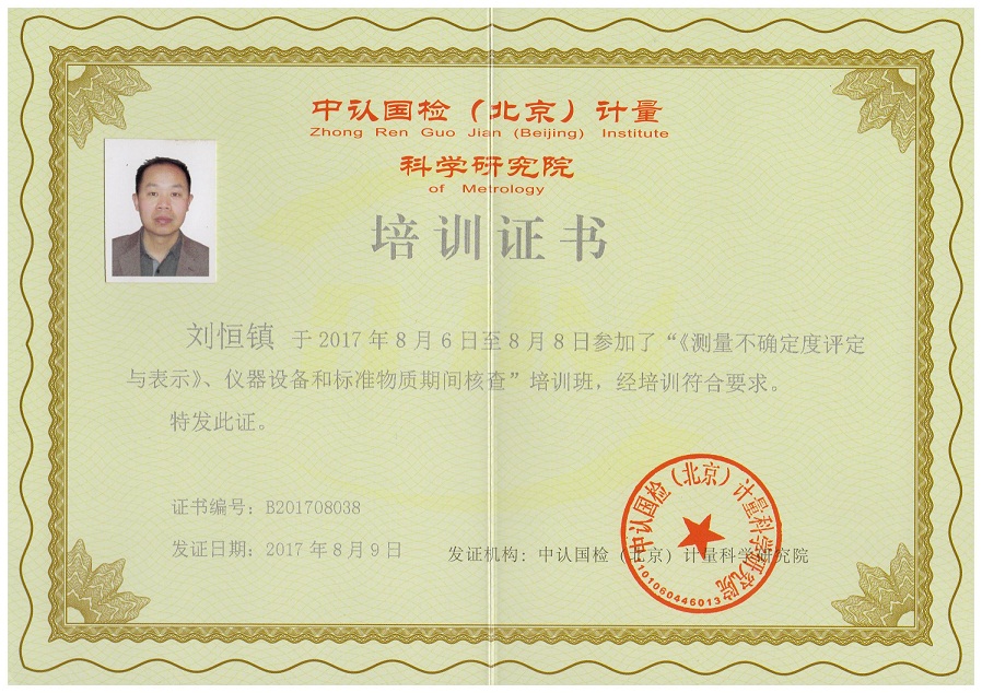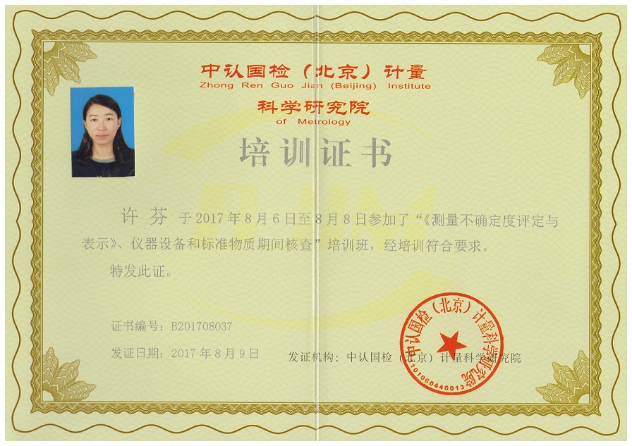 為了加強(qiáng)我院的測量不確定度及標(biāo)準(zhǔn)物質(zhì)期間核查的能力,我院選派了胡堅(jiān)虹、劉恒鎮(zhèn)、吳健、許芬四位技術(shù)人員參加了于2017年8月6日在廈門八山酒店開展的“新版《測量不確定度評價(jià)與表示》、儀器設(shè)備和標(biāo)準(zhǔn)物質(zhì)期間核查”的培訓(xùn)學(xué)習(xí),培訓(xùn)為期三天,并獲得了由中認(rèn)國檢(北京)計(jì)量科學(xué)研究院頒發(fā)的培訓(xùn)證書。